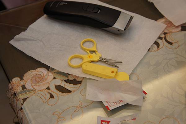 滿月當天,早上忙著搬出月子中心, 下午先將客廳收拾出一個乾淨區域,以備晚上的剃髮
