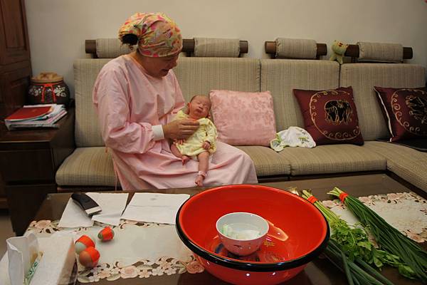 阿娟先幫寶寶擦臉,剃髮後, 分別將綁上紅紙的各類物品放置在寶寶身上,同時口念各種祝福語, 例如蔥就是聰明,芹菜就是勤勞等,很有意思,我們和公婆,小叔, 邊看邊拍照邊哈哈大笑, 尤其是看到baby半睡夢間配合著儀式進行,模樣十分逗趣