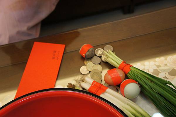 在阿娟到之前,老公已準備好了桌上這十樣東西,分別是雞蛋、鴨蛋、助膽石、五十元硬幣六枚、十元硬幣六枚、蔥一小把、韭菜一小把、芹菜一小把、一個臉盆、一條毛巾另外再準備一個紅包袋是要裝小穎的胎毛的,到時候胎毛就可以和臍帶一起拿去做發財章了。